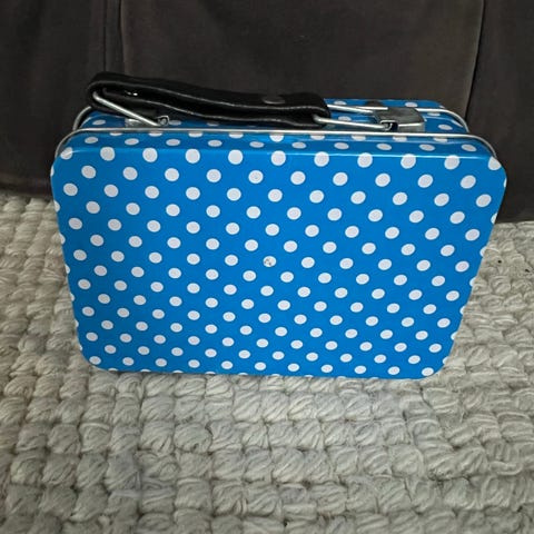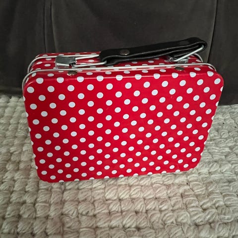 Maileg legetøj bestående af to metal kufferter i blå og rød farve. Den blå kuffert har hvide prikker og hjerte-design, den røde kuffert er mærket som et førstehjælpskit. Velegnet til børns leg og opbevaring af småting.