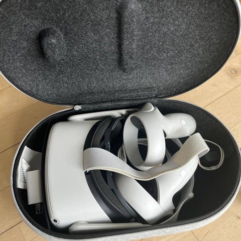 Meta Quest 2 Virtual Reality Headset i hvid farve. Sættet inkluderer headset, to trådløse controllere, opladerkabel med adapter og etui. Designet til brug med forskellige VR-applikationer og spil.