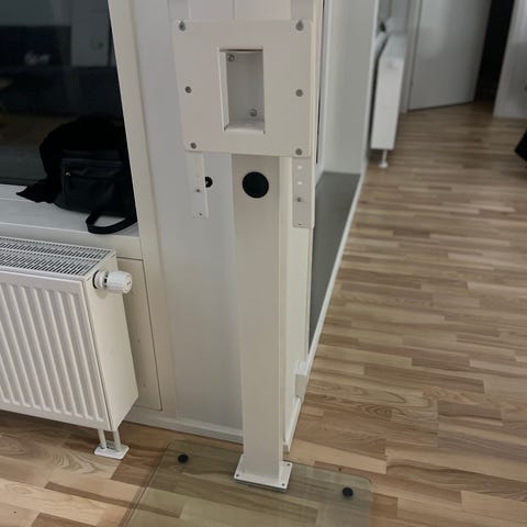 Højden på stativet, fjernsynet hænger på, er 116 cm fra gulv, men højden på fjernsynet kan justeres i beslagene.
