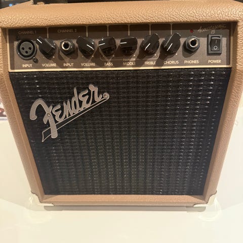 Fender Acoustasonic 15 guitarudstyr med en effekt på 35W, designet til akustiske guitarer. Udstyret har flere kontrolknapper til justering af lyd, herunder volume, bass, mid, treble, reverb og chorus. Enheden har indgange til mikrofon og guitar samt hovedtelefonudgang. Farven er brun med et klassisk Fender-design.