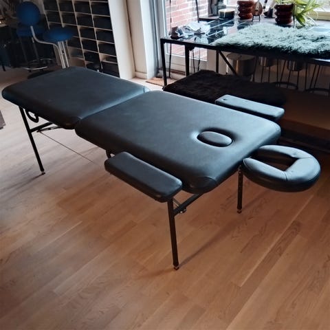 Zen massagebriks med sort polstring og træstel. Fremstår meget gedigen og stabil. Briksen inkluderer justerbar hovedstøtte og 2 armlæn. Armlæn kan evt bruges til at forlænge briksen med en ca. 20 cm.