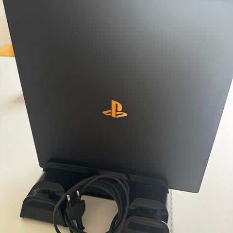 Den nyeste udgave af ps4 pro, hvisket betyder den ikke larmer så meget som den ældre version. Der medfølger to controllere.