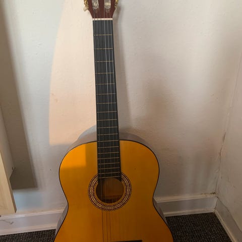 Akustisk guitar med trækrop. Guitarens overflade har en naturlig træfinish. Designet til akustisk lydproduktion uden elektrisk forstærkning.