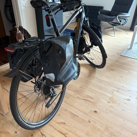 Fed Scott cykel som har fået skiftet dæk til city bike dæk og med en hel masse medfølgende tilbehør.