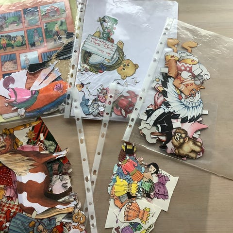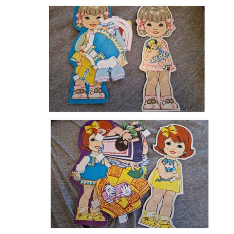 4 dukker samt meget tøj og tilbehør. Den ene dukke har tapet hovedet på.