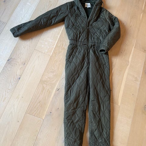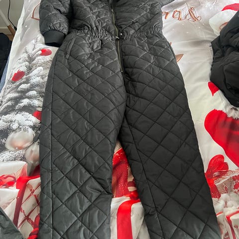 med guld farvetlynlås foran, brystlomme med guldfarvet lynlås, sidelommer med guldfarvet lynlås , bånd i livet med guldfarvet vedhæng, krave+ manchetter i ribkant, kantbånd ved ankler, foret med fleece i overdelen, virkelig lækker, sender gerne, dog ikke med fiks færdig, porto oveni