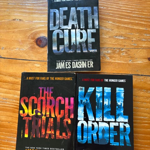 James Dashner The Maze Runner Series bøger, indeholder tre bøger: The Maze Runner, The Scorch Trials og The Death Cure. Serien er i paperback-format med farverige omslag, velegnet til læsere interesseret i ungdoms- og science fiction-genren.