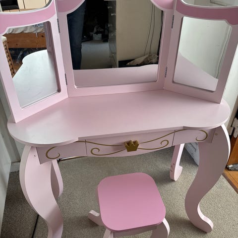 Brugt sminkebord. Min datter har været temmelig rundhåndet med neglelakken, og det ses tydeligt på bordpladen. Kan måske fjernes. Vandskader (tror jeg) Se billeder.
