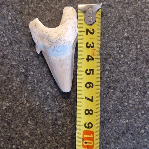 Stor Otodus Obliquus fossil hajtand i sten. Inkl info-kort, 2 hvidhaj tænder og en sandtigerhaj tand medfølger også.