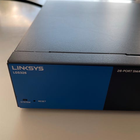 Linksys netværksswitch med flere porte til tilslutning af netværksenheder. Enheden er designet til at forbedre netværksforbindelser og håndtere dataoverførsel mellem tilsluttede enheder.