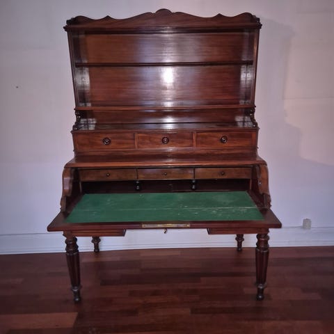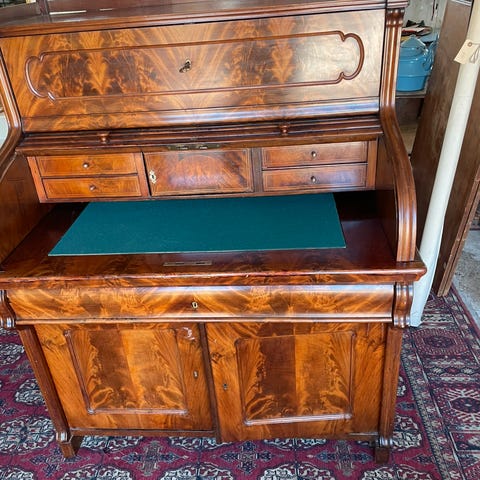 Fint amerikaner skrivebord - brugt men i fin stand. Bredde 127 højde 113 dybde 73 kasser under 40 bred højde 73,5 cm. Pris er fast