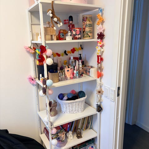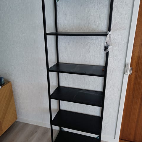 Reol fra skuret, som er blevet tilovers. Temmelig solid. Vist fra Ikea.