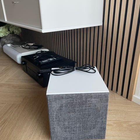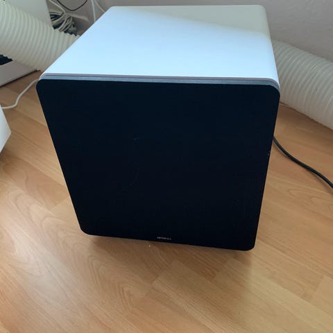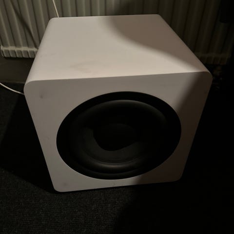 Argon 6170W subwoofer med tilslutningsmuligheder på bagsiden, herunder RCA og højttalerterminaler. Subwooferen har et træfinish kabinet og to runde basenheder med hvidt ydre. Designet til brug i lydsystemer til forbedring af baslyd.