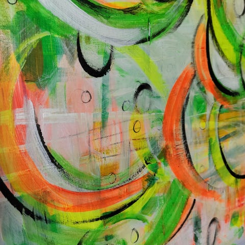 Abstrakt maleri udført i skryl på lærred med en blanding af farver som blå, grøn, orange og gule nuancer. Maleriet har en tekstureret overflade og fremviser en organisk, flydende form med hvide linjer. Velegnet til dekorativ brug i hjem eller kontor.