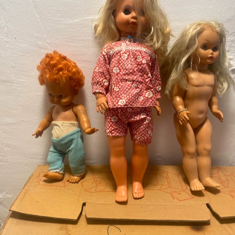 Dukkerne kan bevæge arme og ben og har hår. Ca. 10 cm.
