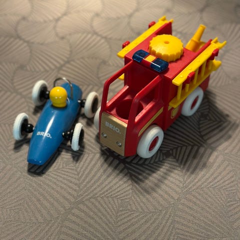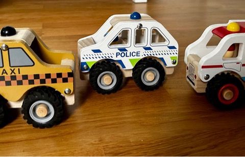 legetøjssæt bestående af trævej med vejskilte og flere små biler i forskellige farver og modeller. Velegnet til børn til leg og læring om trafik og køretøjer.