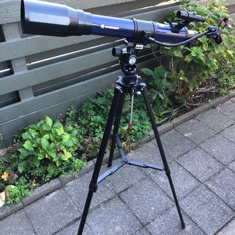 Hej. Jeg sælger dette 8 tommer Dobson teleskop med monteringsbase og flere linser. Teleskopet har en sølvfarvet krop og leveres med forskellige okularer og filtre til observation. Velegnet til astronomi og stjernekiggeri.