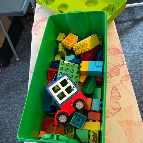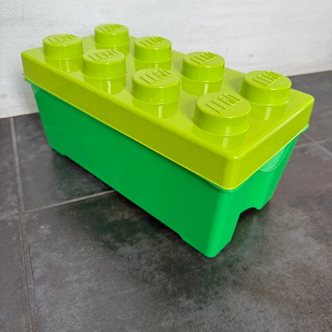 Grøn Lego opbevaringskasse med indhold af 84 klodser og 2 figurer.