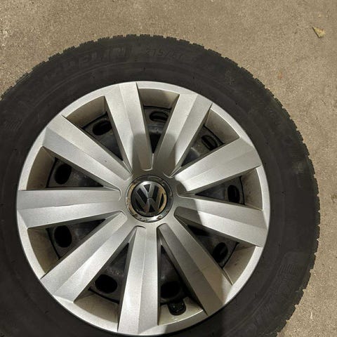 Vinterdæk med stålfælge i størrelse 215/60R16 95H. Dækkene har siddet på en Passat