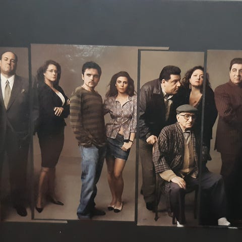 The Sopranos DVD box sæt med billeder af hovedpersonerne fra tv-serien på coveret. Indeholder flere sæsoner af serien.