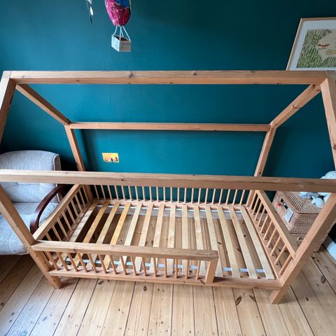 Sengestel til børneseng (husseng) 80 x 160 cm lavet af massivt fyrretræ. Madras medfører. Sengen er skilt ad.