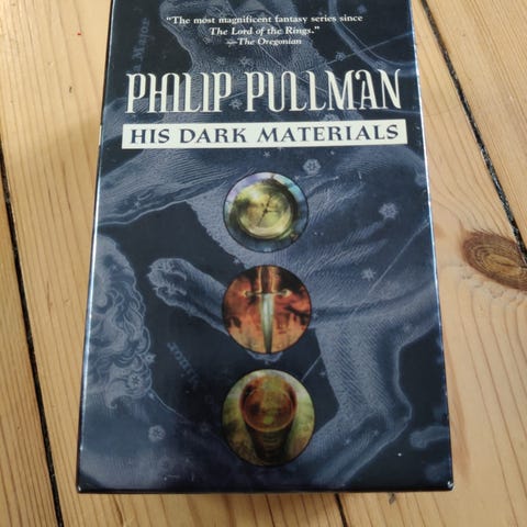 Philip Pullman Bogserie His Dark Materials indeholder tre bøger plus ekstra bog: Det Gyldne Kompas, Skyggernes Kniv, Ravkikkerten og Forestillinger om Støv. Serien er kendt for sin fantasy-genre og komplekse fortælling.