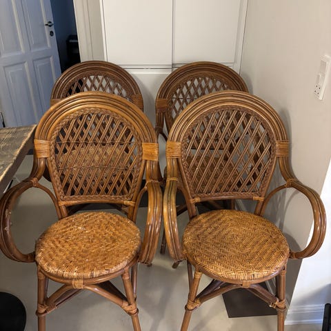 patineret spisebordsstole i bambus/flet. Rigtig lækre spisebordsstole med armlæn og god rygstøtte hvor man bare sidder så godt en hel aften! De er i god stand men trænger dog til en omgang spraymaling.