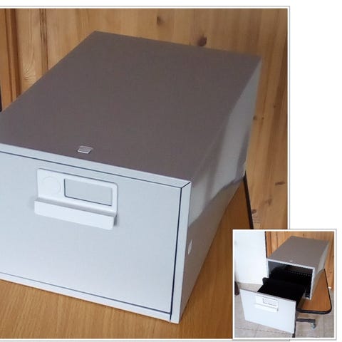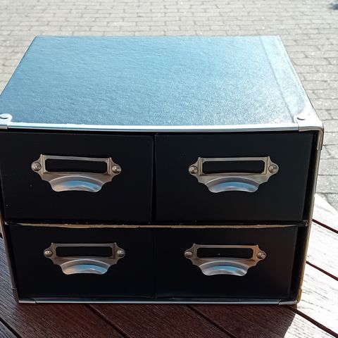 Arkivboks med guldhåndtag og alfabetisk skillekort