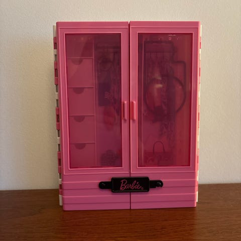 Barbie Legetøj Skab i pink farve. Skabet har to døre med gennemsigtige paneler og indvendige rum til opbevaring af småting og tøj til Barbie-dukker. Egnet til børns leg og opbevaring af Barbie-tilbehør.