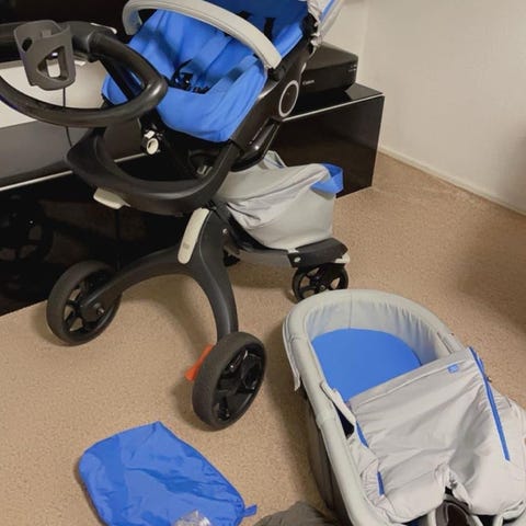 Stokke barnevogn med autostol og lift i grå