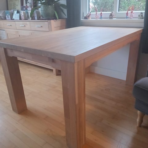 Hvidolieret egetræsbord i pæn stand med 2 tillægsplader der måler 100x56 cm stk. Ingen skrammer men kan friskes op med en gang olie