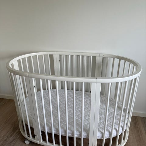Lettere brugt Stokke Sleepi børneseng i farven Hvid med Sleepi madras, med tilhørende "Mini" og "junior" kit.