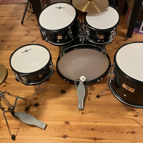 Remo Kids Percussion sæt bestående af tre trommer med farverige motiver og en trommestik. Trommerne har Remo skind og er designet til børn. Sættet inkluderer trommer i forskellige størrelser.