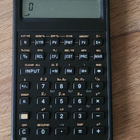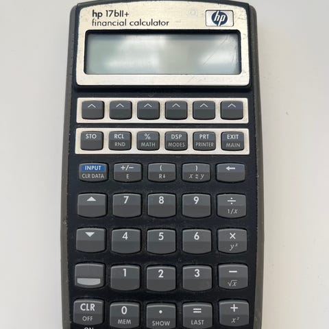 HP Hewlett-Packard 12C platinum lommeregner med sort tastatur og sølvgrå ramme. En finansiel lommeregner kendt for brug i økonomi og regnskab. Inkluderer beskyttende sort læderetui med HP-logo.