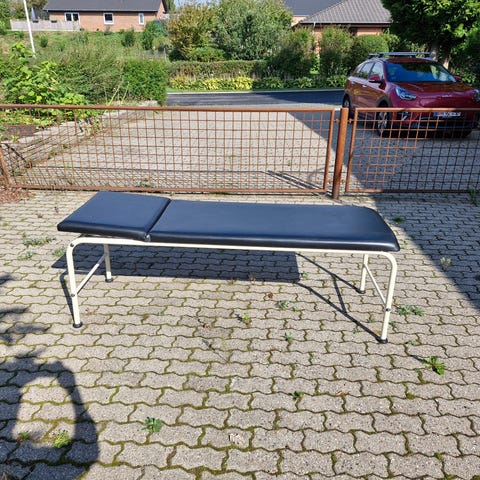 Seers Medical behandlingsbriks. Elbriks har justerbar højde og flere sektioner, herunder hovedstøtte med ansigtsudskæring og armlæn. Konstruktionen er lavet af metal med hjul for nem flytning.