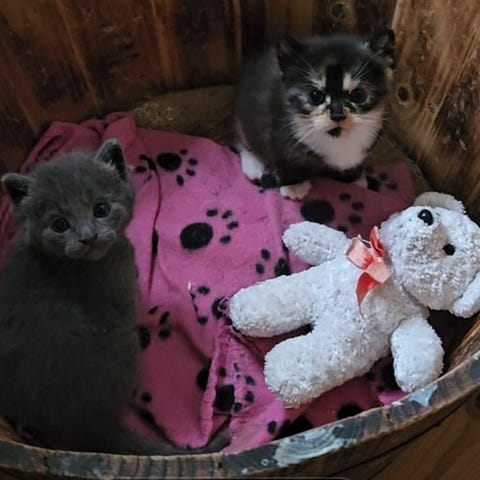 2 killinger på 12 uger (1 han der er grå og 1 hun der er hvid) og 1 hunkat (Moren til killingerne på sidste billede)