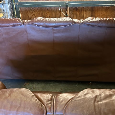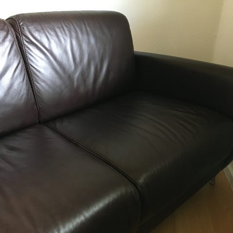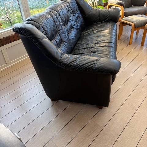 3- pers. sort lædersofa. Sofaen har et klassisk design, mærke STOUBY. Gavle med tremmer i bøg samt ben i bøg.