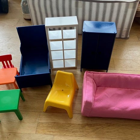 IKEA HUSET børnemøbler sæt bestående af flere dele i forskellige farver, herunder stole, sofa og opbevaringsmøbler. Materialet er primært plast. Sættet er designet til børn og kan bruges til leg og indretning af dukkehuse.