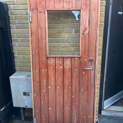 Trædør højde 200 cm, bredde 84 cm, tykkelse 8,5 cm til udendørs brug, vist i billeder med beslag og hængsler. Døren er delvist malet i rød og naturtræfarve. Velegnet til udskiftning eller renovering af eksisterende dør i træbyggeri.