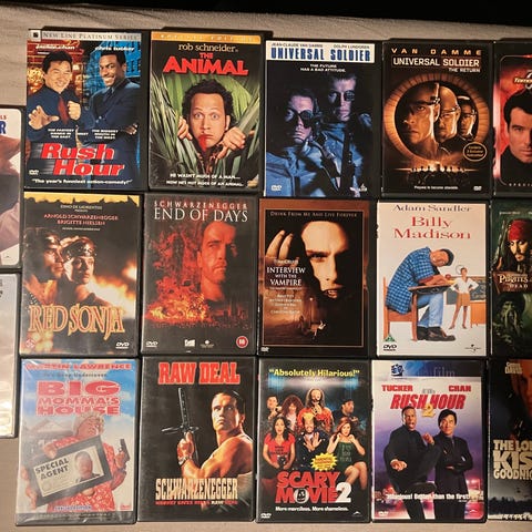 Samling af 20 DVD film med forskellige titler og genrer. Indeholder film som Major Payne, Dragon, Grey Axel, Miami Vice, og flere. DVD'erne er i standard størrelse og kompatible med almindelige DVD-afspillere.