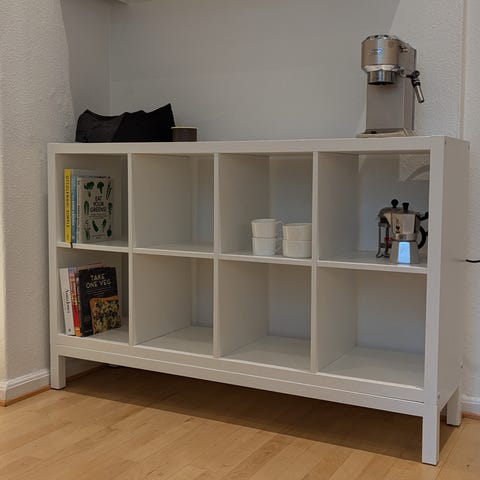 Reolen har en enkel og funktionel opbevaringsløsning med to rækker af fire kvadratiske rum. Velegnet til opbevaring af bøger, opbevaringskasser, vinylplader eller andre genstande.