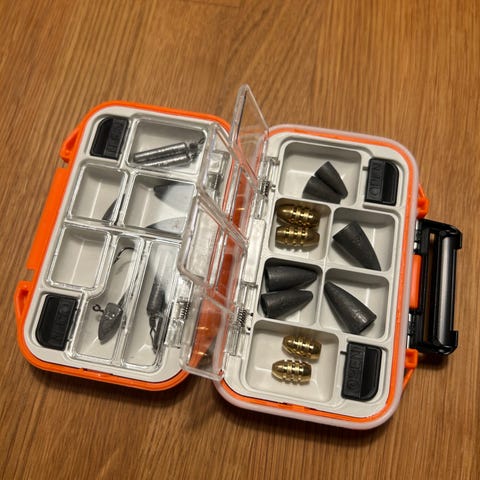 Grejæske Tackle Box med flere rum til opbevaring af fiskegrej. 20 x 11 x 5,5 cm. Boksen er orange og vandtæt pga pakning.. Den har gennemsigtige låg til nem oversigt over indholdet og sikre låsemekanismer. Størrelsen af rum kan tilpasses. Velegnet til opbevaring af kroge, vægte og andet småt fiskegrej. (fiskegrej medfølger ikke)