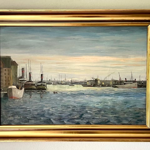 Maleri, sign., havneparti med skib