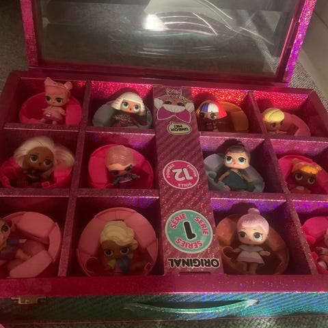 12 L.O.L. Surprise dukker og tilbehør, herunder små dukker, kapsler og forskellige tilbehør i flere farver. Sættet indeholder mange små dele, der kan samles og leges med.