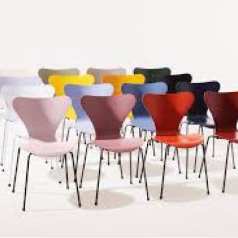 Flotte og klassiske grå 7'er stol. Stolene er netop blevet malet af en professionel maler og fremstår derfor i rigtig fin stand. Dog mangler flere af stolene de sorte “fødder” på stolebenene.