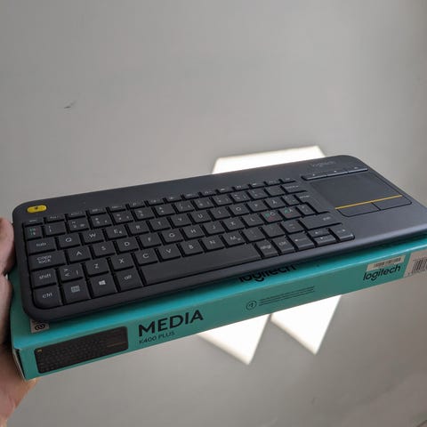 Logitech K400r tastatur med integreret touchpad. Trådløst design, sort farve. Velegnet til brug med pc'er og smart-tv for nem navigation og indtastning.