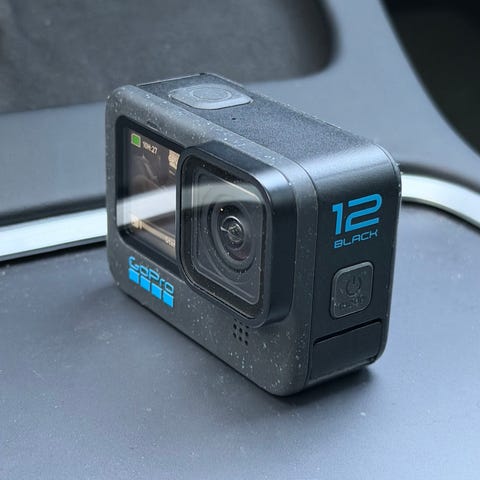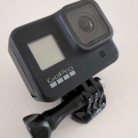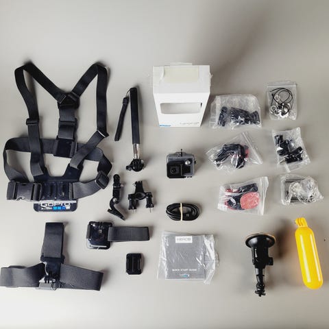 GoPro HERO4 actionkamera med tilbehør. Kameraet har en kompakt størrelse og er designet til optagelse af video og billeder i forskellige miljøer. Inkluderer beskyttende huse og monteringsudstyr.