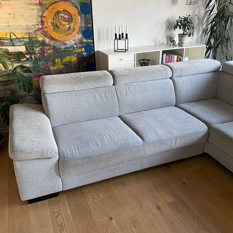 Ilva hjørnesofa i gråt stof. Sofaen har en modulopbygning med chaiselong til højre. Materialet er tekstil, og sofaen har justerbare nakkestøtter. Designet til stuebrug med plads til flere personer.