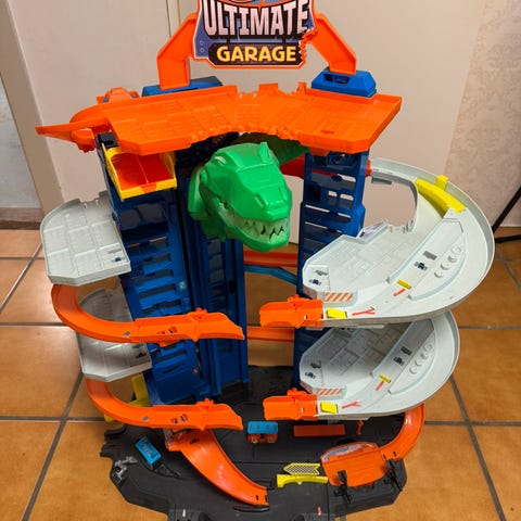 Dette parkeringshus-legesæt har lys, lyde og elevator mellem alle fire niveauer. Der er en rampe side om side til ræs, en spiralrampe med en gnavende haj og plads til op til 36 biler.