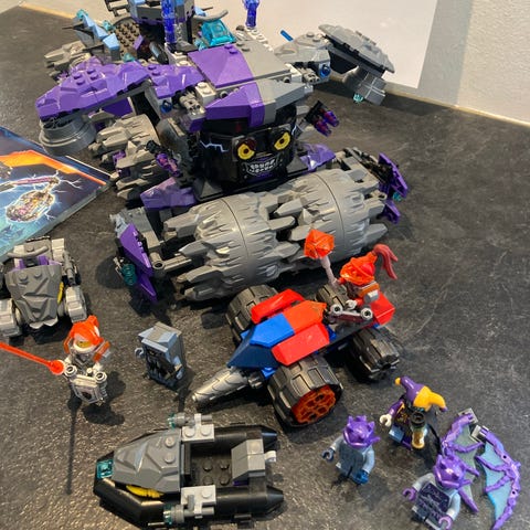 LEGO NEXO Knights legetøjssæt med flere figurer, et tårn og forskellige tilbehør. Sættet indeholder byggeklodser i forskellige farver og former, herunder skjolde og små våben. Egnet til børn, der interesserer sig for fantasy og eventyr.
